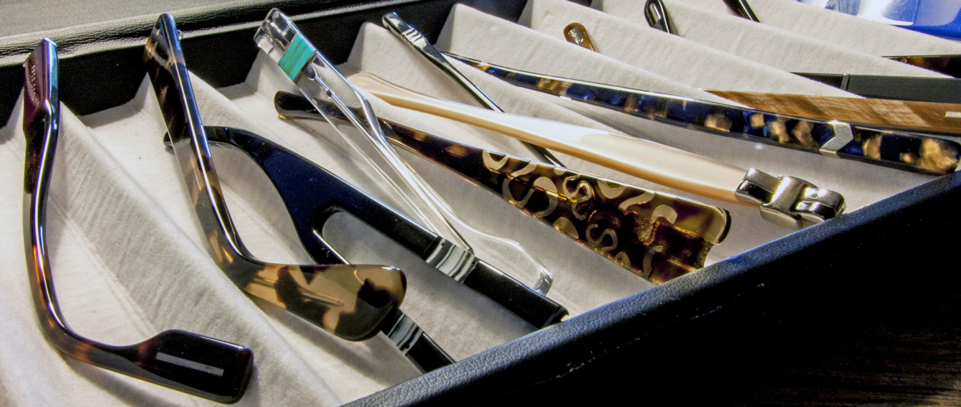 made from acetate, wood, buffalo horn, carbon fiber, and fabrics designed in-house or based on the customer's drawings.