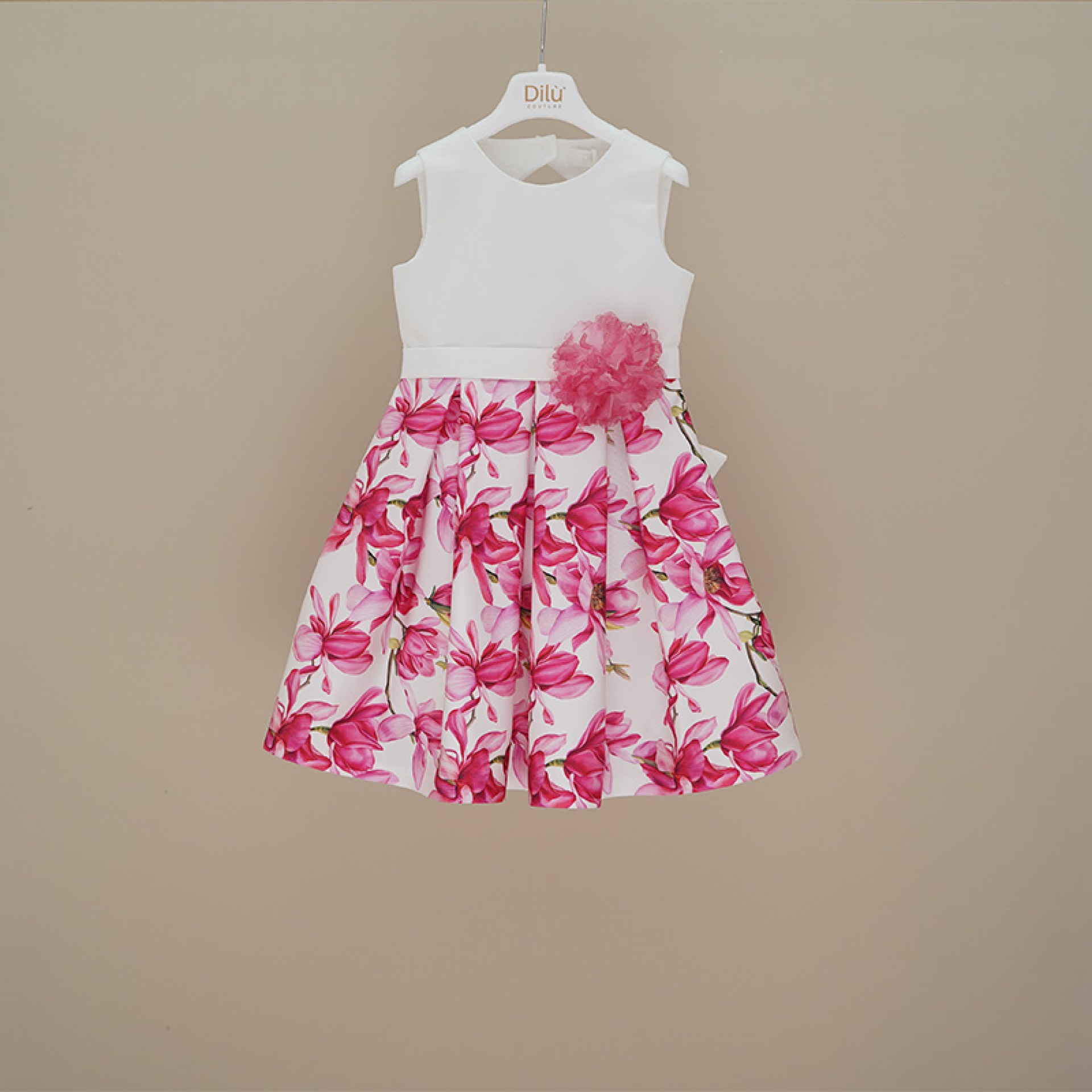 Perfect for spring events, this dress is decorated with a central fabric flower and a vibrant skirt with floral theme print. Modern elegance for girls.