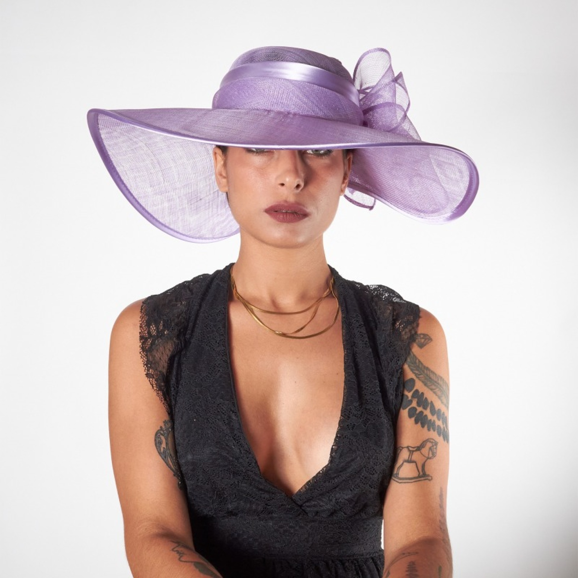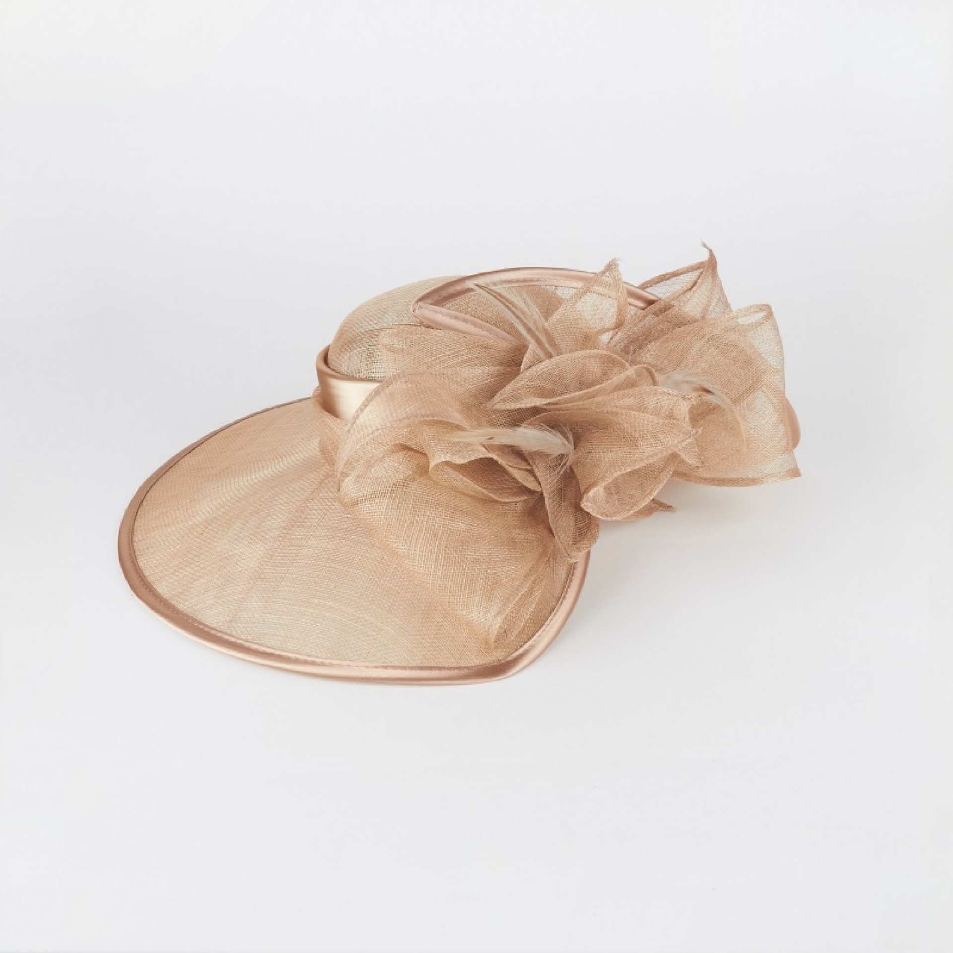 Un elegante cappello da cerimonia realizzato in pregiato tessuto Sinamay, rifinito con un luminoso nastro di raso tono su tono. Un modello sofisticato pensato per matrimoni e occasioni speciali caratterizzato da una forma asimmetrica e da un maxi volume dato dal fiore applicato sul retro, impreziosito da leggere piume. Un simbolo di eleganza, perfetto per eventi indimenticabili.