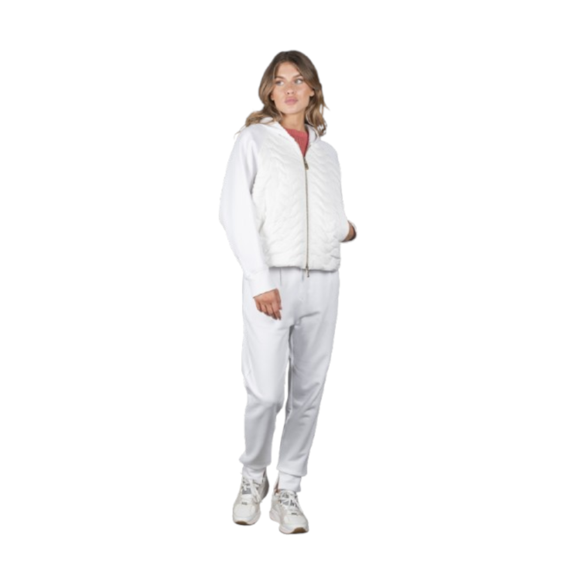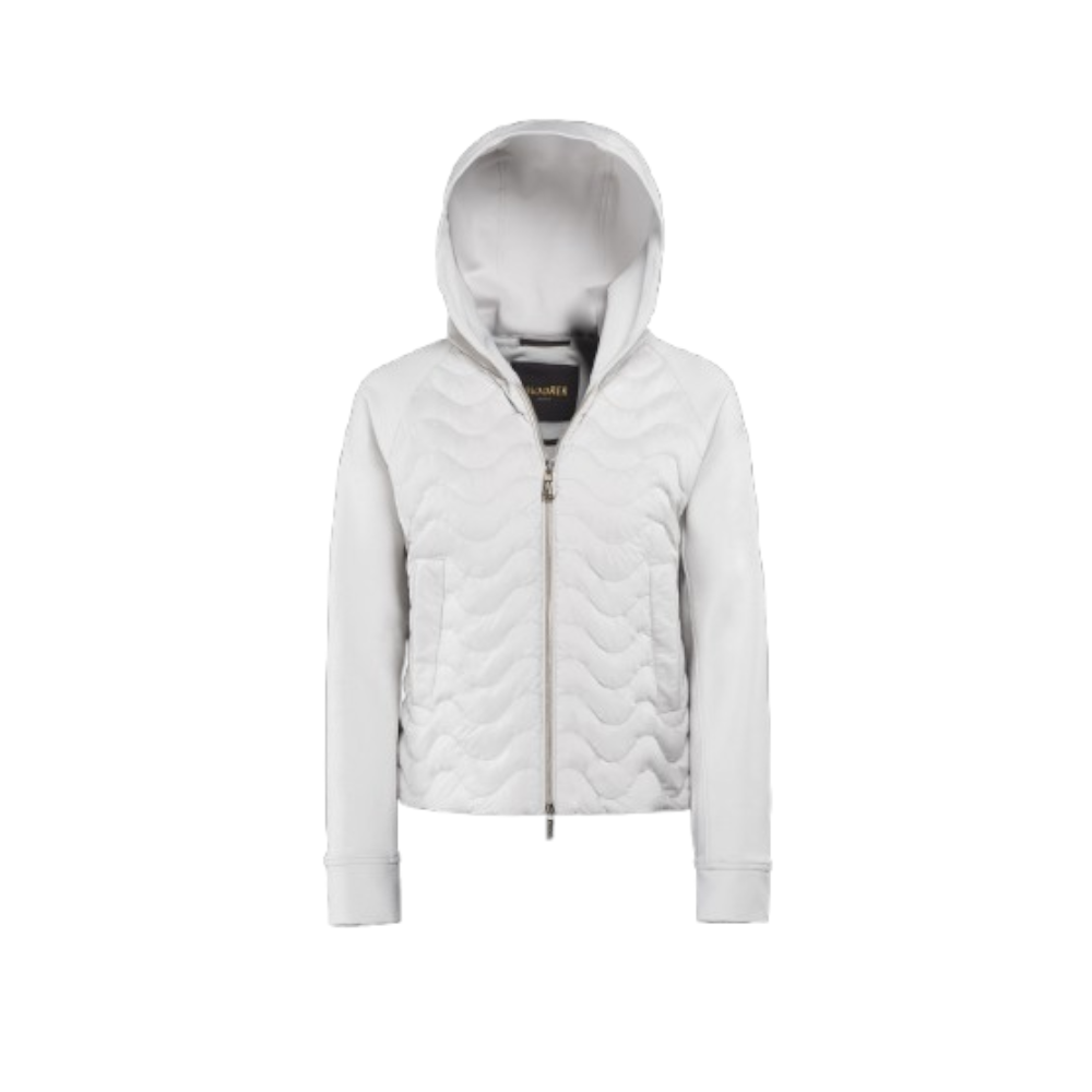 Bomber ibrido dalla vestibilità over, realizzato in un mix di materiali. Cappuccio, maniche e schiena realizzati in jersey interlock con finissimo cotone Supima e poliestere elasticizzati. Il busto è realizzato in leggera microfibra cangiante con texture soffice e vellutata, imbottito in piuma d'oca e trapuntato ad onde.