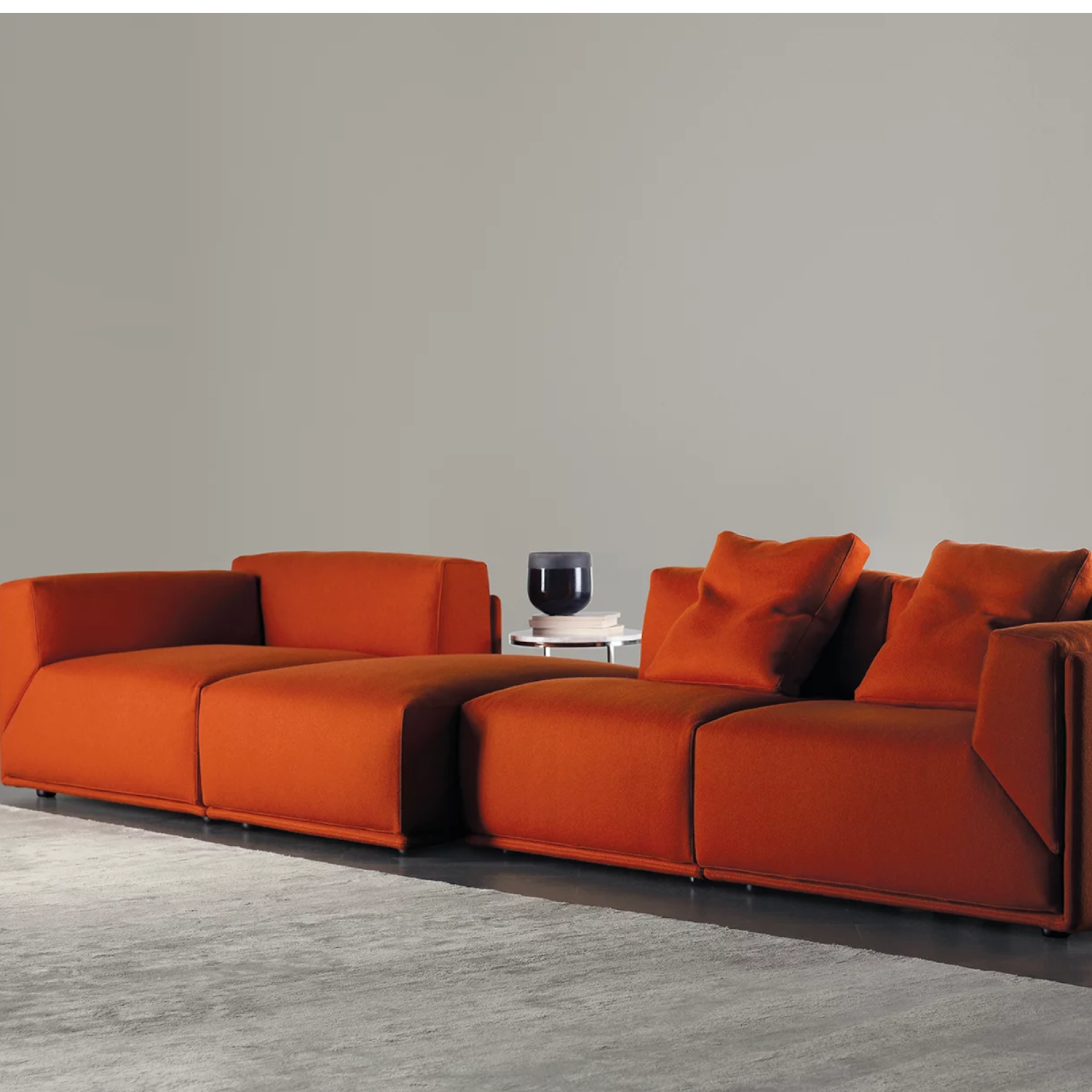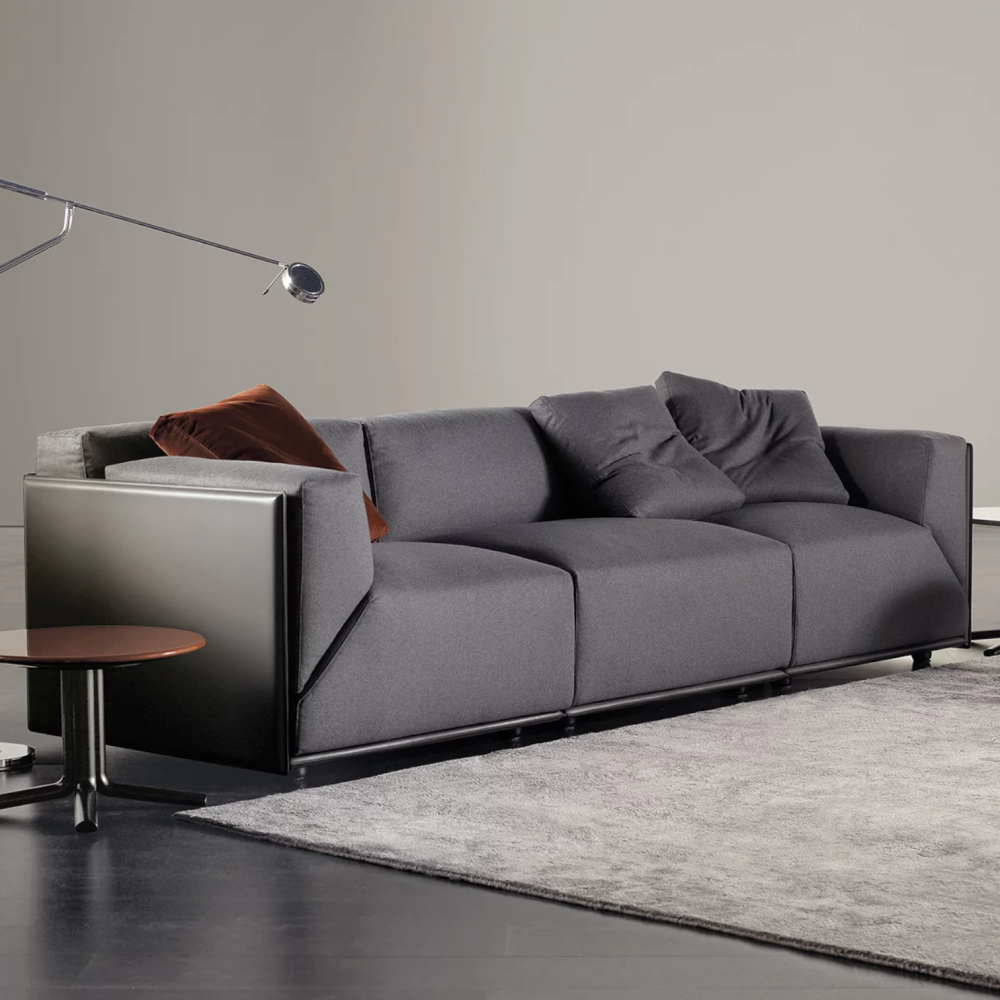 Divano modulare dalle forme pure e contraddistinto da un’estrema versatilità compositiva. La sottile scocca esterna, disponibile anche nella versione in cuoio per un look più maschile e deciso, accoglie i morbidi cuscini di schienale e seduta caratterizzati dal taglio netto a 45 gradi. Elementi disponibili in diverse dimensioni e in due profondità garantiscono la massima libertà compositiva. La presenza della struttura esterna offre lo spunto per raffinati abbinamenti di pelle e tessuto o di tessuti differenti.